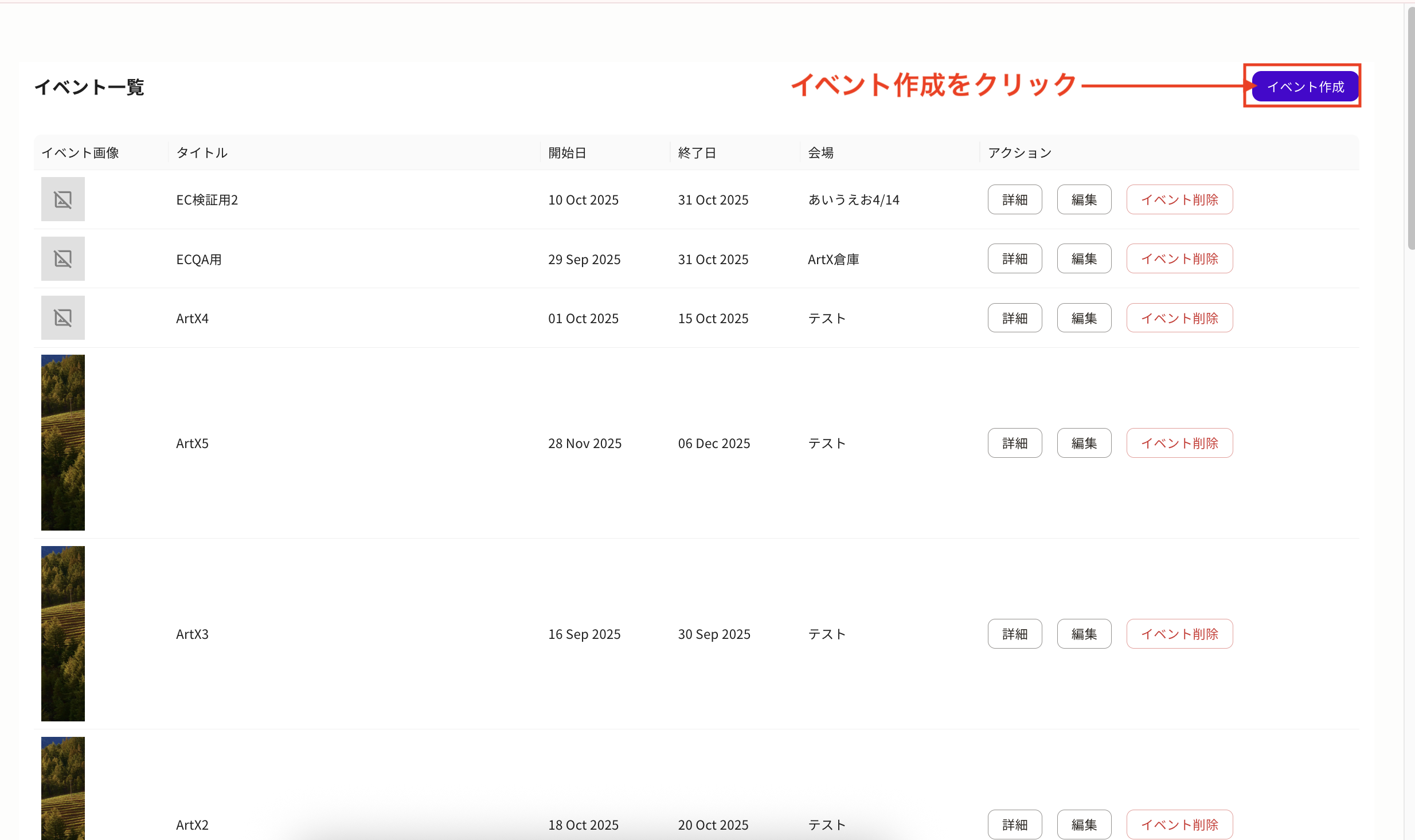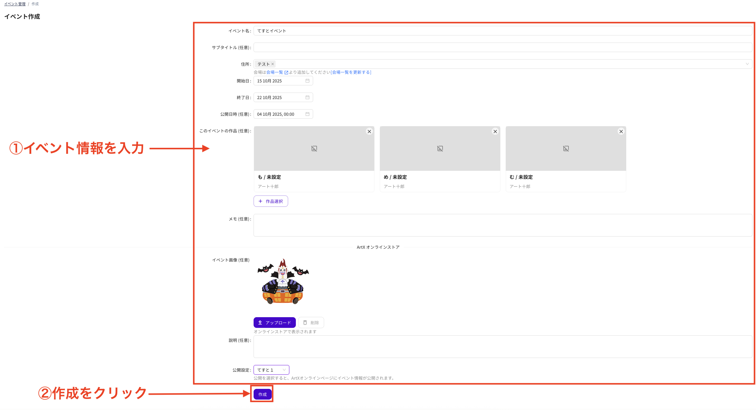 - 右上の「イベント作成」ボタンをクリックし、会期・会場・展示作品などの情報を入力して登録します
