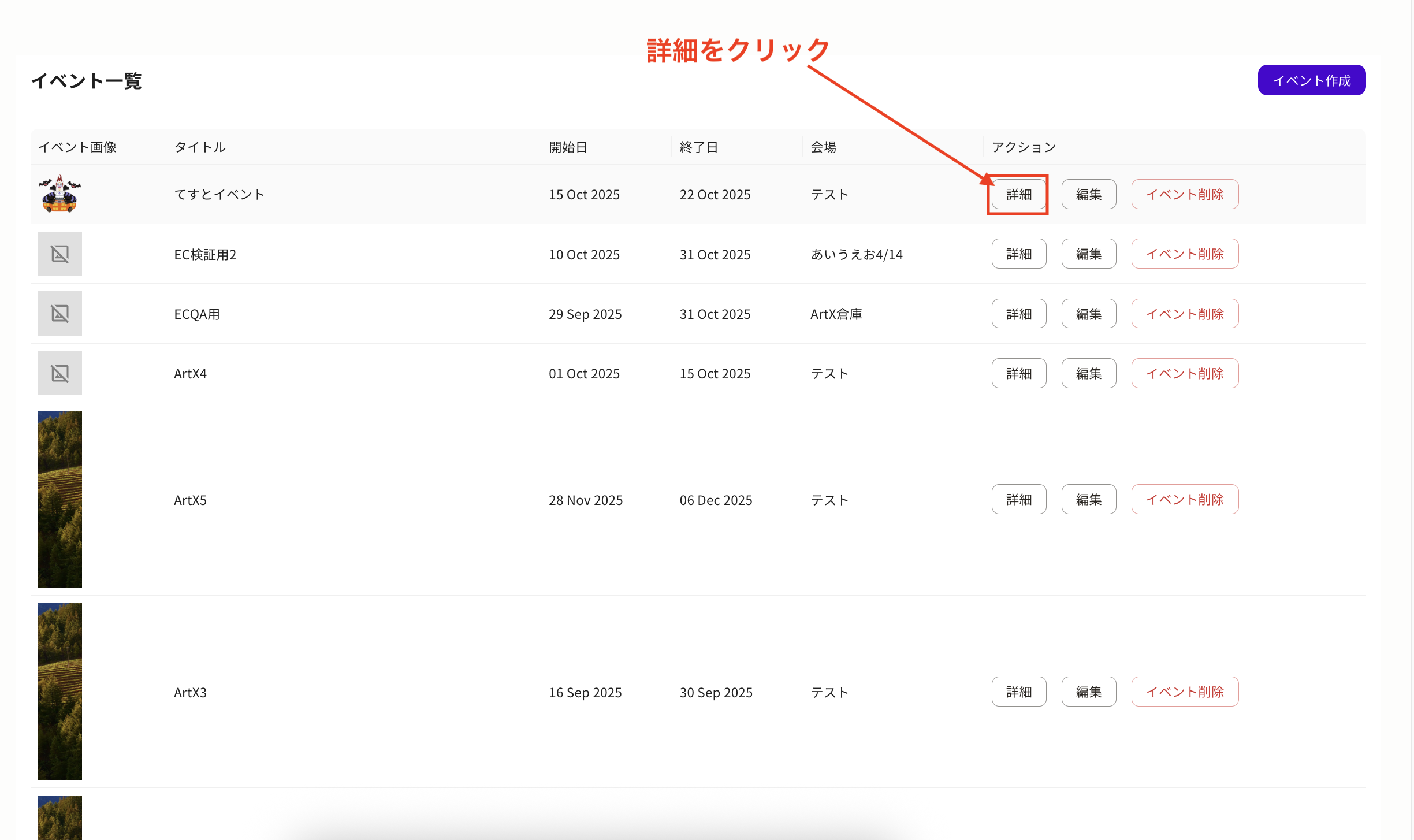 - 「イベント一覧」から該当イベントを選択し、「詳細」をクリックします