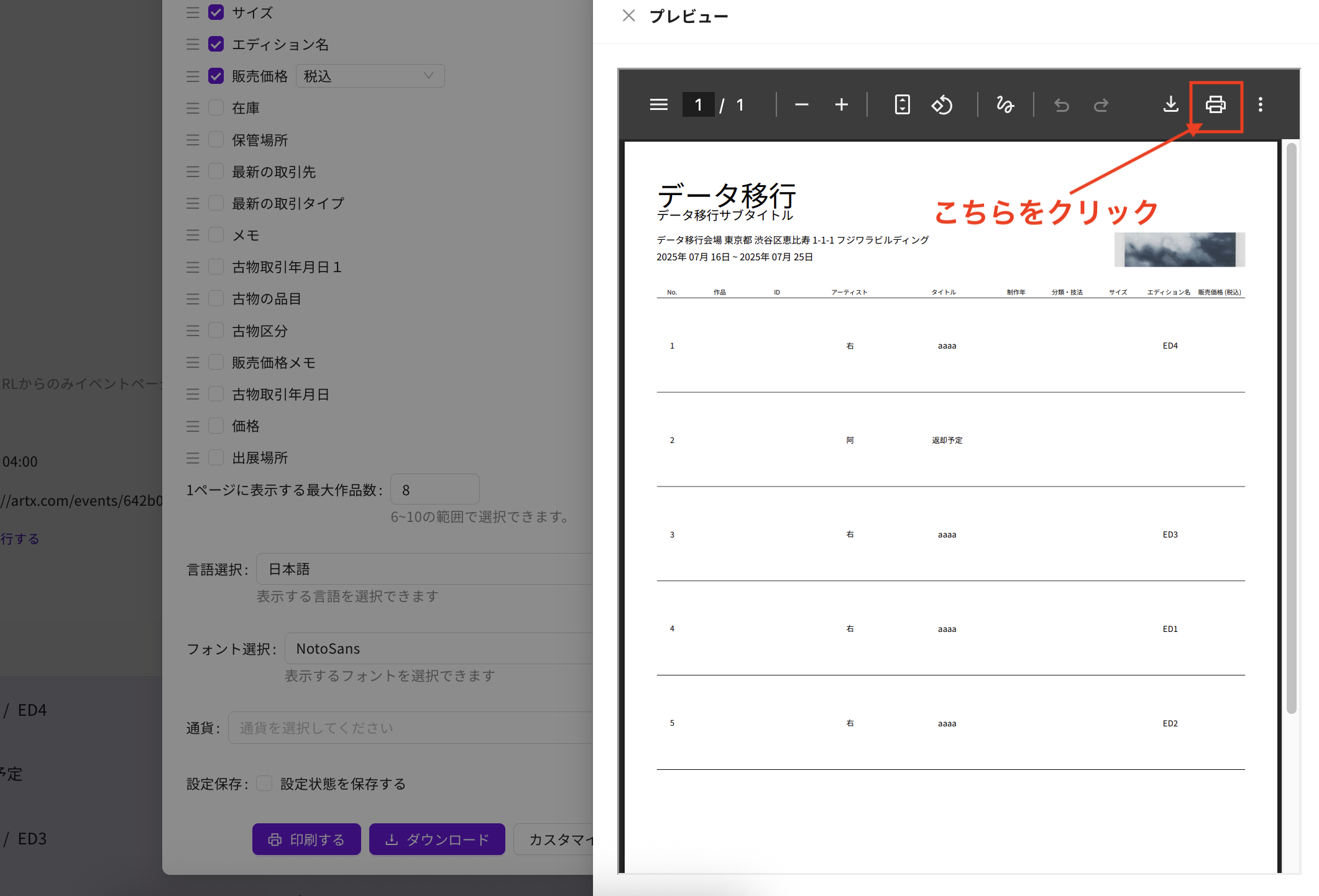 - 「印刷する」ボタンをクリックすると、登録済みの展示作品をまとめたカタログPDFが出力されます